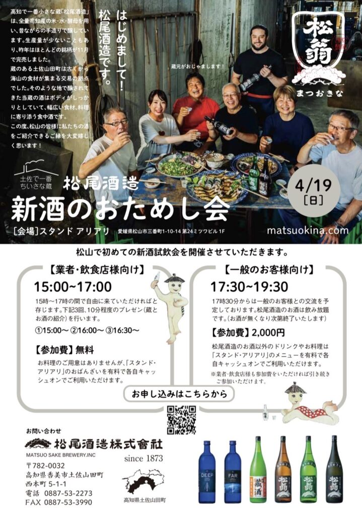 参加費:2,000円17時30分からは一般のお客様との香料を予定しております。松尾酒造のお酒は飲み放題です。(お酒がなくなり次第終了いたします)