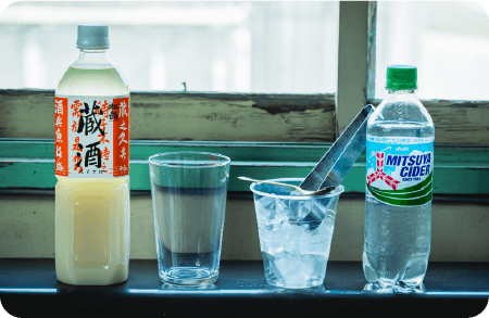冷えた蔵酒と冷えた三ツ矢サイダー、グラス、氷、マドラーを用意します。